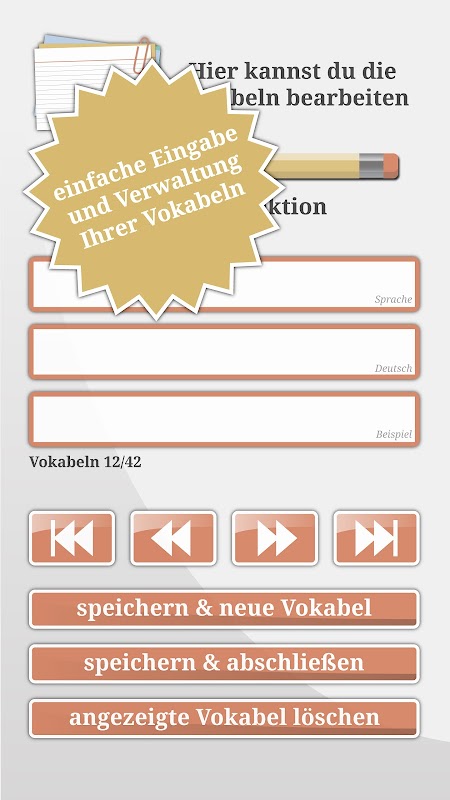 ทุกการเริ่มต้นเป็นเรื่องยาก - แต่ด้วยครูฝึกคำศัพท์ของเรา คุณสามารถฝึกคำศัพท์ที่ไม่ถูกต้องได้เข้มข้นยิ่งขึ้น ในฐานะ? ง่ายมาก! แอพคำศัพท์ของเราจำคำตอบที่ผิดของคุณ เช่นเดียวกับในกล่องดัชนีบัตร คำศัพท์เหล่านี้จะถูกถามถึงความต้องการ นอกจากนี้ เราได้พัฒนาระบบความคืบหน้าสำหรับ "หลายตัวเลือก" และ "การทดสอบด้วยเสียง" คุณสามารถตรวจสอบระดับความรู้ของคุณโดยใช้แอพคำศัพท์ได้ตลอดเวลา