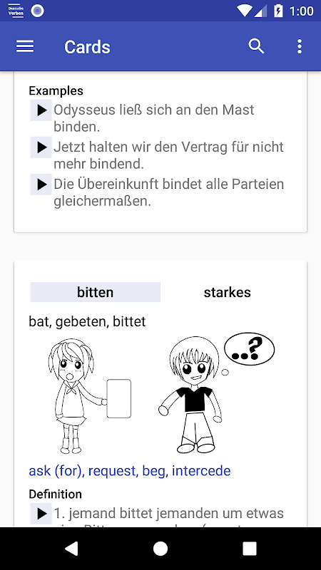 แอปพลิเคชั่นนี้ช่วยให้คุณเรียนรู้คำกริยาภาษาเยอรมันที่อ่อนแอแข็งแกร่งและผสม