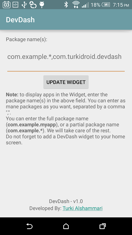 With this app, every developer can have a simple widget that acts as dashboard for his under-development apps. The widget provides shortcuts to common task. Namely, DevDash widget can do the following: