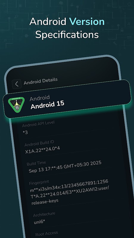 - อุปกรณ์: แสดงรุ่นปัจจุบัน ประเภทฮาร์ดแวร์ รหัส Android โซนเวลา และชื่อผู้ผลิต