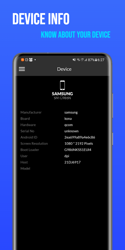 ข้อมูลอุปกรณ์ คือข้อมูลจำเพาะโดยละเอียดของโทรศัพท์ของคุณ ซึ่งรวมถึงการกำหนดค่าฮาร์ดแวร์ที่เป็นไปได้ทั้งหมดและรายละเอียดที่จำเป็นอื่นๆ เกี่ยวกับอุปกรณ์ของคุณ ผู้ที่เชี่ยวชาญด้านเทคโนโลยีมักจะสงสัยเกี่ยวกับฮาร์ดแวร์ของตนเองและสิ่งที่อยู่ภายใต้อุปกรณ์ของตน Device Info ให้ข้อมูลทุกประเภทแก่ผู้ใช้ซึ่งจัดกลุ่มตามรายละเอียดด้านล่าง: