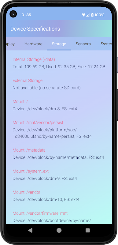 ข้อมูลแบบเรียลไทม์และข้อมูลจำเพาะสำหรับเซ็นเซอร์ทั้งหมดที่มี: เครื่องวัดความเร่ง, ไจโรสโคป, เครื่องวัดสนามแม่เหล็ก และอื่นๆ