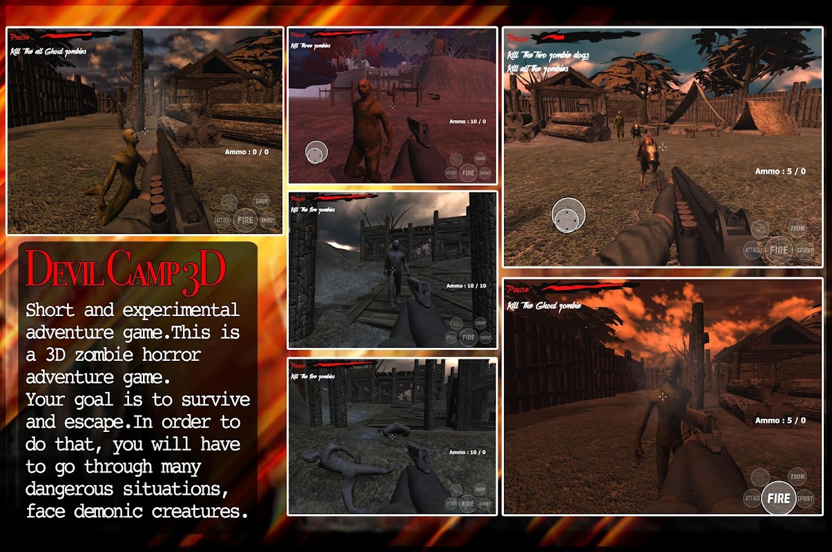 Short and experimental adventure game .This is a 3D zombie horror adventure game. Your goal is to survive and escape. In order to do that, you will have to go through many dangerous situations, face demonic creatures.Devil Camp 3D is the most fun and challenging game if you are so into about Zombie game.Making the most of your limited resource, kill the most of the zombies, get more score.