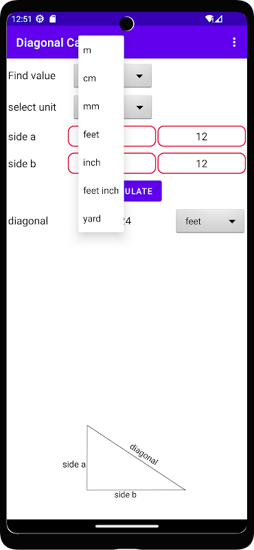 การคำนวณแนวทแยงส่วนใหญ่จะใช้ในงานก่อสร้างเพื่อตรวจสอบข้ามงาน แอพนี้คำนวณเส้นทแยงมุมโดยใช้ทฤษฎีบทปีทาโกรัส ในแอพนี้คุณสามารถป้อนขนาดในหน่วยต่างๆ เช่น เมตร ฟุต-นิ้ว หลา มม. เป็นต้น
