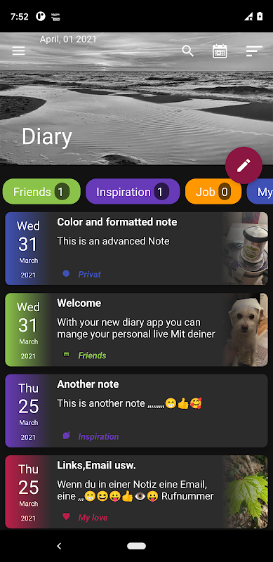 - แอปไดอารี่สามารถรับโน้ตและรูปภาพจากแอพอื่น ๆ สิ่งที่จำเป็นต้องมีก็คือแอพอื่นนี้รองรับ ตัวอย่างเช่นนำเข้าบันทึกย่อจากแอป Diary อื่น