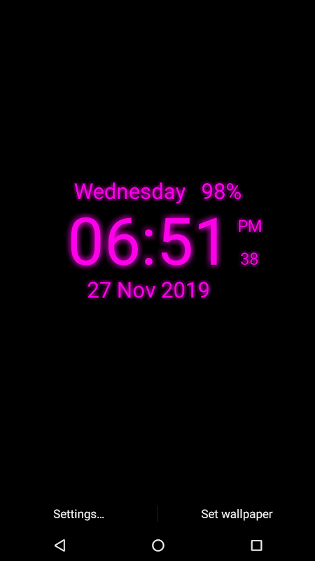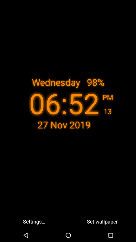 นาฬิกาดิจิตอลวอลล์เปเปอร์แสดงวันที่เวลา (12 Hr และ 24 Hr) แบตเตอรี่ในอัตราร้อยละของหน้าจอโทรศัพท์ในรูปแบบดิจิตอลที่มีรูปแบบที่เรียบง่าย เวลายังแสดงรูปแบบ 12 Hr หรือ 24 Hr ตามที่คุณเลือกเรายังเพิ่มรูปแบบวันที่มากตามที่คุณต้องการเลือกหากคุณไม่ต้องการตัวบ่งชี้เช่นวินาที, แบตเตอรี่, วันที่ดังนั้นเพียงเลือกซ่อนและไม่แสดงในหน้าจอ คุณสามารถเลือกสีของนาฬิกาได้ด้วยตัวเปลี่ยนสีและรูปแบบนาฬิกาสองแบบเพียงแค่เลือกรูปแบบนาฬิกา