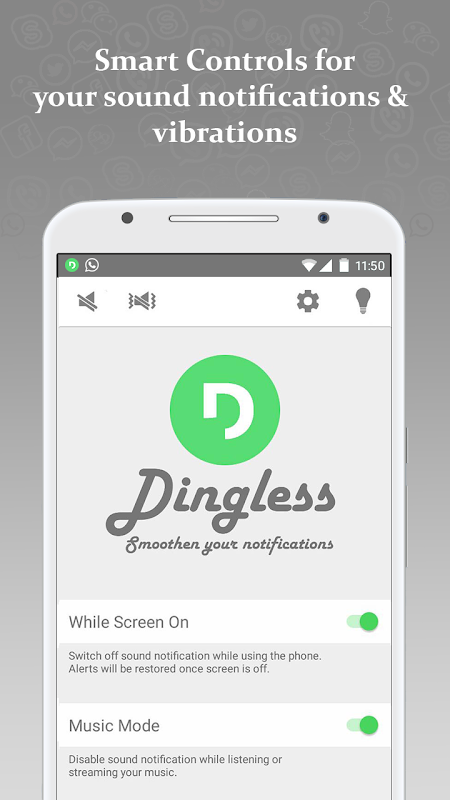 With Dingless there is no need to silence your phone anymore, or totally switch off notification sound in order to avoid annoying alerts coming from your chatting application like Whatsapp, Facebook Messenger or Viber. Be discrete, Go Dingless!
