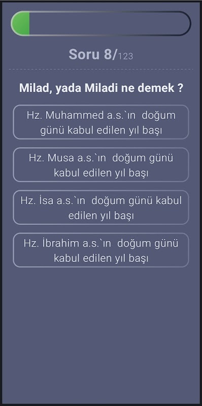 แอปพลิเคชั่นนี้ประกอบด้วยคำถามประมาณ 123 คำถาม บันทึกคำถามล่าสุดที่คุณตอบ ดังนั้นคุณจึงไม่เริ่มต้นใหม่