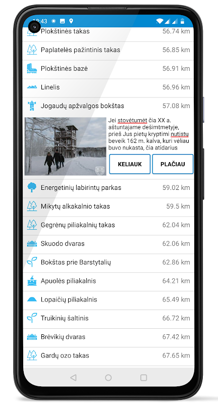 โปรแกรมนี้ออกแบบมาสำหรับผู้ที่ต้องการทำความรู้จักประเทศของตนให้ดีขึ้น สิ่งที่คุณต้องมีคือตำแหน่งปัจจุบันของคุณและโปรแกรมจะระบุสถานที่ที่สวยที่สุดในลิทัวเนีย พวกมันจะแสดงในรายการ จัดเรียงตามระยะทางจากตำแหน่งปัจจุบันของคุณ หรือเพียงแค่บนแผนที่ โดยคลิกที่ไอคอนบนแผนที่แล้วคลิกที่ข้อความ - คุณจะสามารถอ่านเพิ่มเติมเกี่ยวกับวัตถุได้