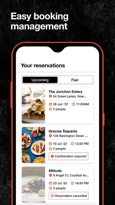 การจัดการการจองที่ง่ายดาย แอป Dish Cult ช่วยให้คุณสามารถแก้ไขหรือยกเลิกการจองของคุณได้อย่างง่ายดาย ซึ่งหมายความว่าไม่ต้องโทรไปที่ร้านอาหารอีกต่อไป ดูตัวอย่างการจองที่กำลังจะเกิดขึ้นและแบ่งปันรายละเอียดกับเพื่อนของคุณจากแอพ ให้คะแนนและรีวิวการจองครั้งก่อนของคุณภายในแอป หรือสัมผัสประสบการณ์อันน่าทึ่งอีกครั้งด้วยการจองซ้ำด้วยการแตะเพียงไม่กี่ครั้ง
