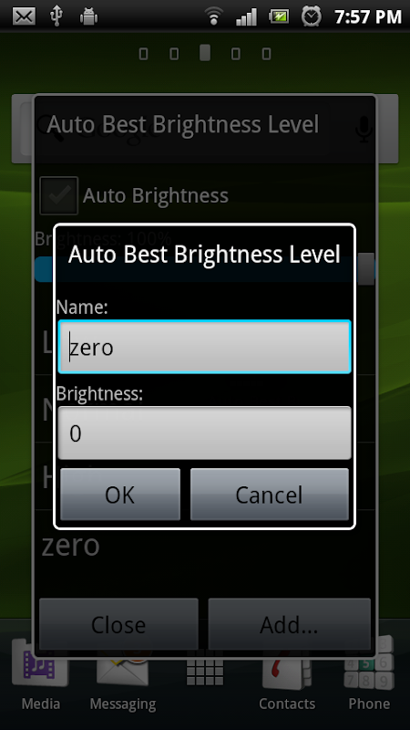 คำเตือน: นี้จะช่วยให้คุณสามารถกำหนดค่าความสว่างที่ยอมรับได้ขั้นต่ำสำหรับหน้าจอโทรศัพท์ของคุณ \ 's การตั้งค่านี้ต่ำเกินไปสามารถทำให้โทรศัพท์ของคุณใช้ไม่ได้ ใช้เสียงและระดับเสียงลงปุ่มเพื่อหาการตั้งค่าความสว่างต่ำสุดที่คุณชอบ นี่คือความสว่างที่จะใช้เมื่อคุณย้ายเลื่อนในโปรแกรมนี้ให้เป็นศูนย์