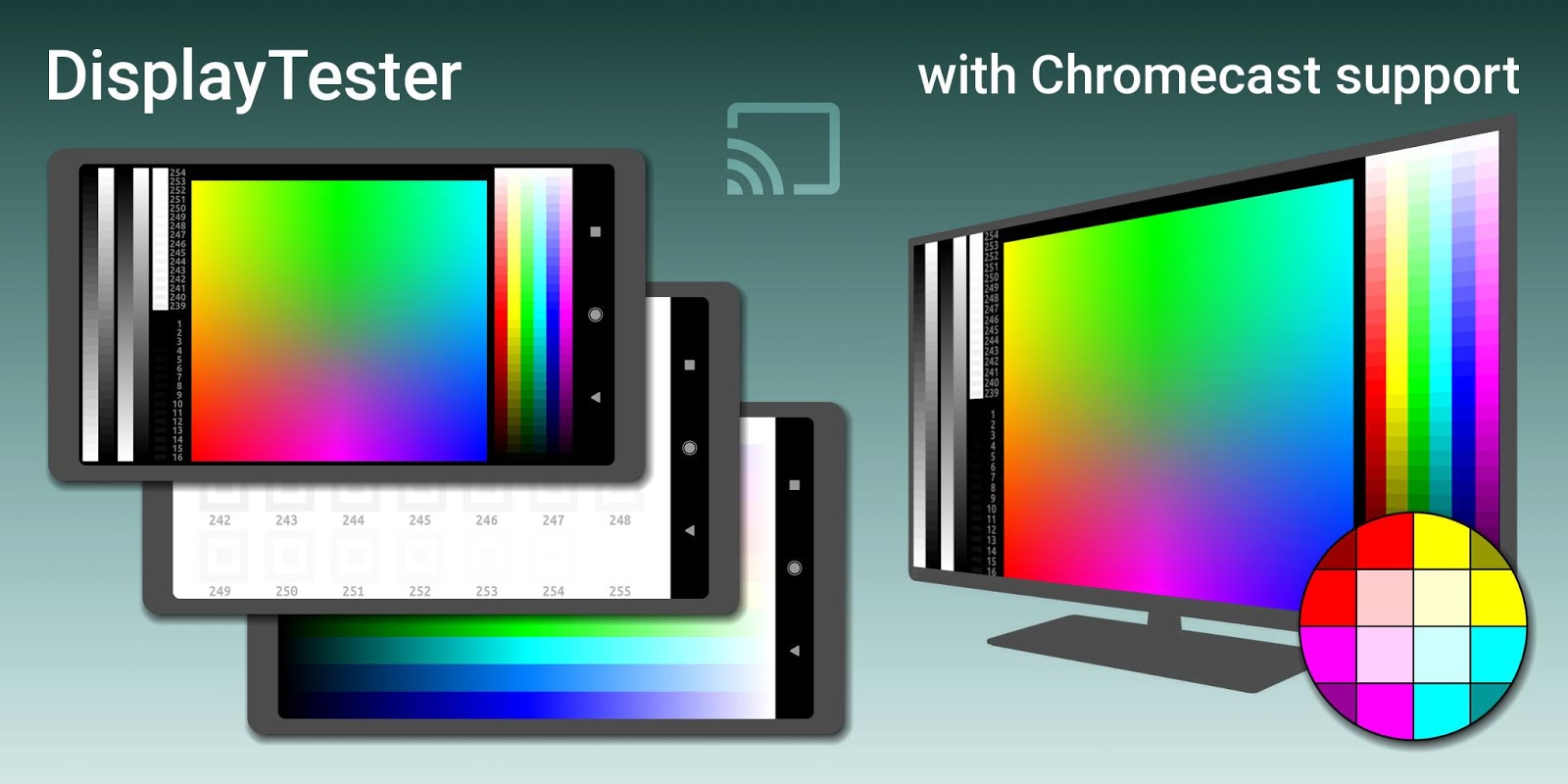 DisplayTester ทำให้มันเป็นไปได้ที่จะทดสอบเกือบทุกแง่มุมของจอแอลซีดี / จอ OLED ของอุปกรณ์ของคุณ การใช้ Google Cast ก็เป็นไปได้ในการทดสอบคุณภาพการแสดงผลของทีวีของคุณ มันถูกออกแบบมาเพื่อให้การทดสอบแบบเต็มหน้าจอนอกจากนี้ยังมีอุปกรณ์ที่มีปุ่มซอฟท์ (ซ่อนปุ่มซอฟท์ใน ICS และต่อมาโหมดดื่มด่ำใน KitKat และต่อมา)