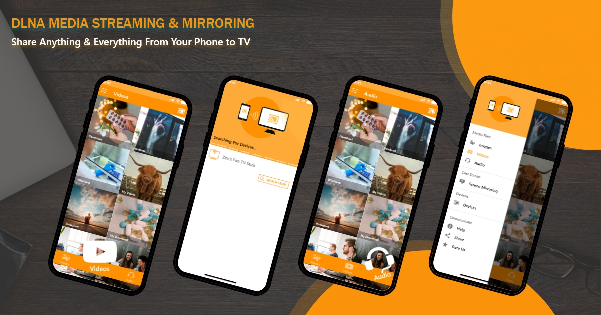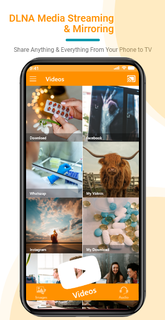 สื่อ DLNA สตรีมมิ่งและมิเรอร์ช่วยให้คุณสามารถสตรีมเนื้อหาสื่อท้องถิ่นของคุณเช่นวิดีโอ HD, ไฟล์เสียงและภาพเพื่อเปิดใช้งาน DLNA มาร์ททีวี App นี้ยังช่วยให้ตัวเลือกที่จะมีส่วนแบ่งผู้ใช้หรือกระจกหน้าจอมือถือของพวกเขาในการเปิดใช้งาน Miracast จอแสดงผลแบบไร้สายหรือมาร์ททีวีหรือดองเกิล Miracast