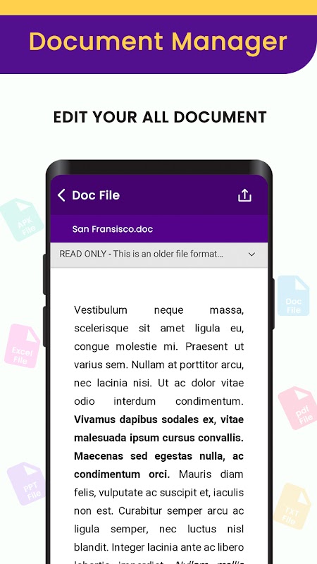 Document Reader and Document Viewer for your phone lets you easily view Word, Excel, PowerPoint, Text and PDF files. It also supports multiple compatibility with office formats including DOC, DOCX, XLS, TXT, XLSX, PPT, PPTX and PDF.