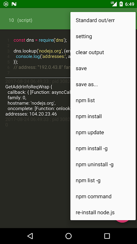 * รันไทม์ node.js (เรียกใช้ ES2015/ES6, ES2016 javascript และ node.js API ใน Android)