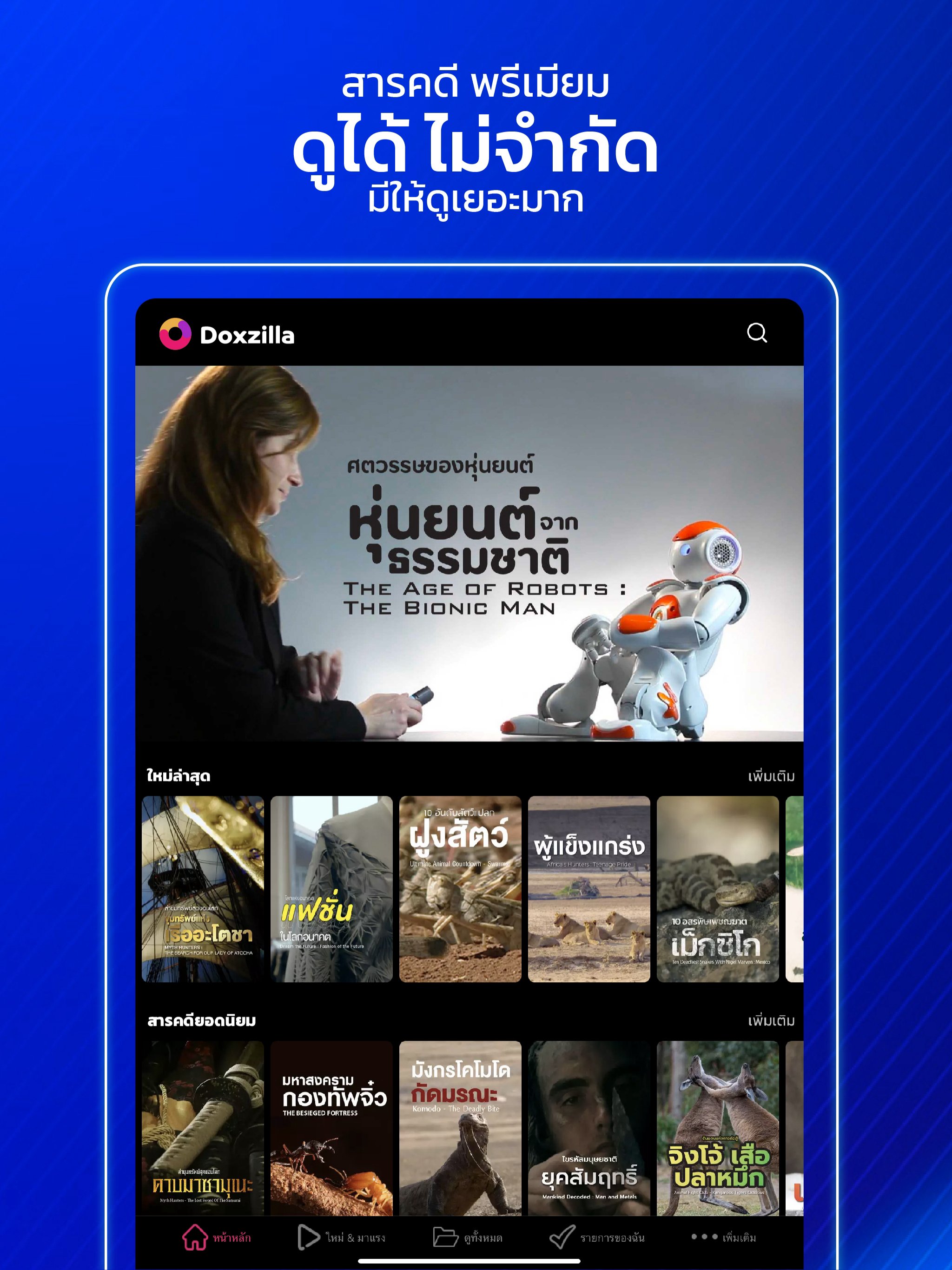 รูปแบบใหม่ ที่ Doxzilla สตรีมมิ่งสารคดี พากย์ไทย 100% อัพเดทใหม่ทุกสัปดาห์ ดูได้ทุกที่ ทุกเวลา ทุก Gen ดูได้ไม่จำกัด บนมือถือ แท็บเล็ต คอมพิวเตอร์ และทีวี คนรักสารคดี ห้ามพลาด! สนุก ตื่นเต้น เต็มอิ่มไปกับสารคดีหลากหลายแนว ทั้งชีวิตสัตว์ ธรรมชาติ วิทยาศาสตร์ ประวัติศาสตร์ วัฒนธรรม โบราณคดี เรื่องลึกลับ ท่องเที่ยว อาหารและอื่น ๆ อีกมากมาย เฉพาะที่ Doxzilla เท่านั้น