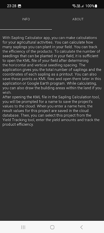 ในการคำนวณจำนวนต้นกล้าที่สามารถปลูกในแปลงนาของคุณได้ เพียงเปิดไฟล์ KML ของแปลงนาของคุณหลังจากกำหนดระยะห่างของต้นกล้าในแนวนอนและแนวตั้งแล้ว คุณยังสามารถระบุมุมของแถวของต้นกล้า แอปพลิเคชันจะแสดงจำนวนต้นกล้าทั้งหมดและพิกัดของต้นอ่อนแต่ละต้นในรูปแบบงานพิมพ์ คุณยังสามารถบันทึกจุดเหล่านี้เป็นไฟล์ KML และเปิดในภายหลังในแอปพลิเคชันนี้หรือโปรแกรม Google Earth ขณะคำนวณ คุณยังสามารถวาดพื้นที่อาคารภายในที่ดินได้หากต้องการ ดังนั้นพื้นที่เหล่านี้จึงไม่รวมอยู่ในบัญชีต้นอ่อน ดังนั้น ฟิลด์เหล่านี้จึงไม่รวมอยู่ในการคำนวณในขณะที่ทำการคำนวณต้นอ่อน