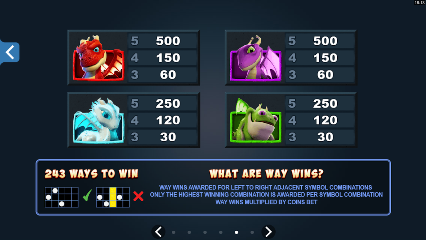 Light up the reels with cute dragons and win the top prize of 107,500 coins! Play for free with bets ranging from 0.40 to 30 per spin. Dragonz offers maximum win on a single bet 107,500 coins, five reels and 243 bet ways. Spin wilds on reel three during a non-winning spin and extra wilds are added to the reels for a guaranteed win. Spin three or more glowing orb scatters and join either Flint, Switch, Frost or Gobble for 10 free spins. While Flint happily delivers up to 10 flaming wilds on each spin, Switch collects non-winning wilds, and then breathes them out onto the reels once she has three! Frost freezes non-winning wilds, locking them into place until they form part of a winning combo, while Gobble randomly spits out winning wilds to set the reels on fire!