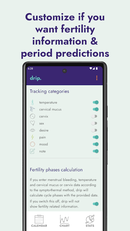 การติดตามรอบประจำเดือนสามารถช่วยให้คุณเข้าใจอาการของร่างกายและให้ข้อมูลเชิงลึกเกี่ยวกับสุขภาพประจำเดือนของคุณ ใช้ดริปเพื่อติดตามรอบเดือนของคุณและเพื่อความตระหนักในภาวะเจริญพันธุ์ ต่างจากแอพติดตามรอบเดือนอื่น ๆ Drip เป็นโอเพ่นซอร์สและทิ้งข้อมูลของคุณไว้ในโทรศัพท์ของคุณ ซึ่งหมายความว่าคุณเป็นผู้ควบคุม