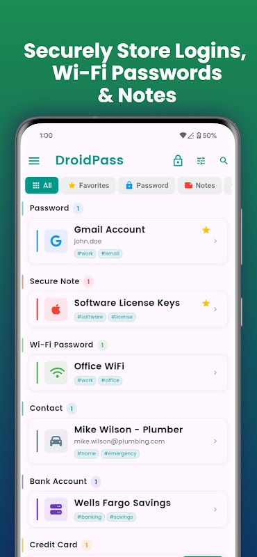 DroidPass จัดเก็บข้อมูลสำหรับเว็บไซต์ต่างๆ ตั้งแต่ธนาคาร การเงิน ไปจนถึงแอปเกมพื้นฐาน ตัวจัดการรหัสผ่านนี้มีตัวสร้างรหัสผ่านอันทรงพลังที่ช่วยสร้างรหัสผ่านที่ปลอดภัยและรักษาข้อมูลของคุณให้ปลอดภัย ข้อมูลทั้งหมดจะถูกเข้ารหัสและซิงค์ระหว่างอุปกรณ์ Android และ iOS ของคุณ