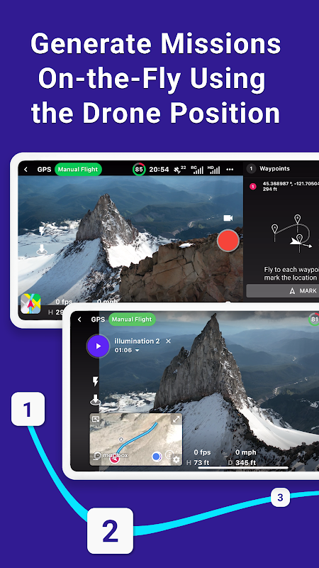 ภารกิจบินสำหรับแผนที่ เวย์พอยท์ วงโคจร พาโน การทำแผนที่แนวตั้ง หรือการตรวจสอบ ใช้โหมดการบิน เช่น วงโคจร การติดตาม หรือโฟกัส เชื่อมโยงภารกิจเข้าด้วยกัน ทำให้ทุกอย่างเป็นอัตโนมัติ และดูตัวอย่างในแบบ 3 มิติ