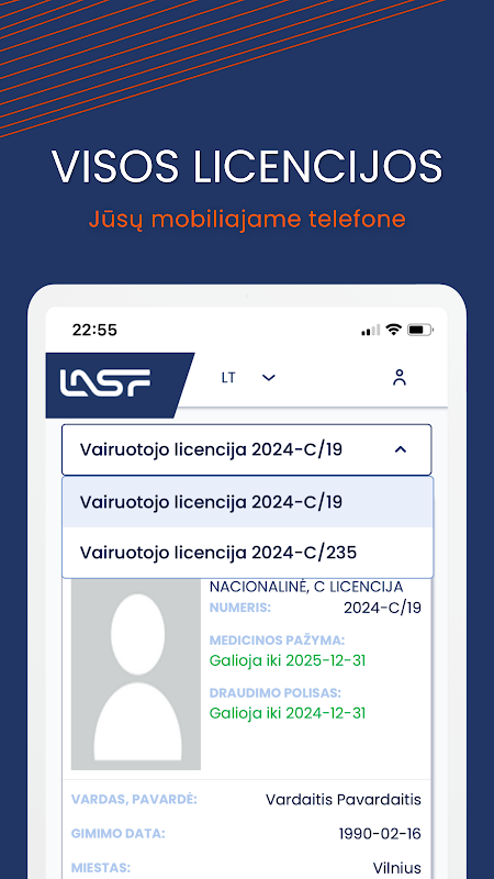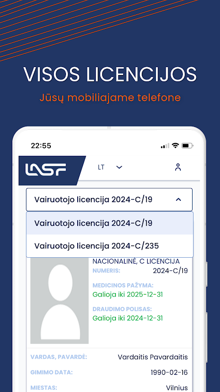 ดาวน์โหลดแอป E-LASF และเชื่อมต่อเพื่อใช้ใบอนุญาตของสหพันธ์กีฬามอเตอร์สปอร์ตลิทัวเนียของคุณสะดวกยิ่งขึ้น อย่าลืมบัตรจริงใบอนุญาต LASF ของคุณอีกครั้ง - ใบอนุญาต LASF ทั้งหมดของคุณจะถูกจัดเก็บไว้ในโทรศัพท์มือถือของคุณพร้อมสำหรับการแข่งขัน