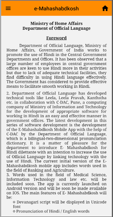 e-Mahashabdkosh เป็นพจนานุกรมการออกเสียงภาษาอังกฤษ - ภาษาฮินดีสองภาษาและสองทิศทางตามโดเมน มันมีเงื่อนไขเทียบเท่าภาษาฮินดีของคำรากศัพท์ภาษาอังกฤษและในทางกลับกัน รายละเอียดของคำรวมถึงคำอธิบายในภาษาฮินดีเช่นเดียวกับภาษาอังกฤษ การใช้ในภาษาฮินดีและภาษาอังกฤษ การออกเสียงของคำราก แอปพลิเคชั่น e-Mahashabdkosh พัฒนาโดย Rajbhasha Vibhag และ C-DAC Pune