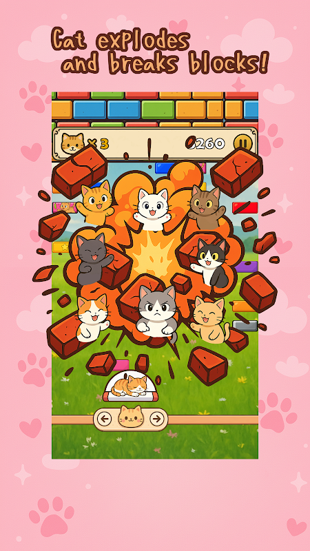 ขยับไม้พายแมวขี่ไปทางซ้ายและขวา เด้งลูกบอลไหมพรม และทำลายบล็อก! ทำลายบล็อกต่อเนื่องเพื่อรับโบนัสคะแนนมหาศาลและเพิ่มพลังด้วยไอเทมพิเศษ