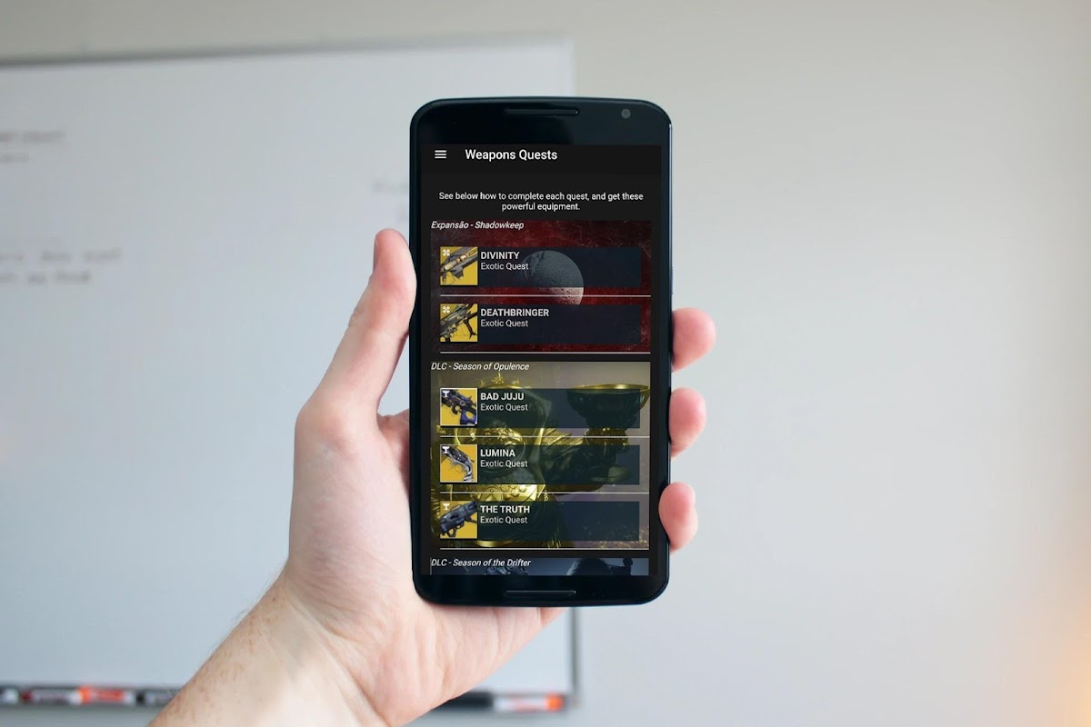 แอพนี้มีคำแนะนำแบบฝึกหัดและเคล็ดลับมากมายเกี่ยวกับวิธีทำกิจกรรมของเกม Destiny 2 ให้สำเร็จและรับอุปกรณ์และรางวัลที่ดีที่สุดโดยไม่ต้องใช้กลโกงหรือการหาประโยชน์
