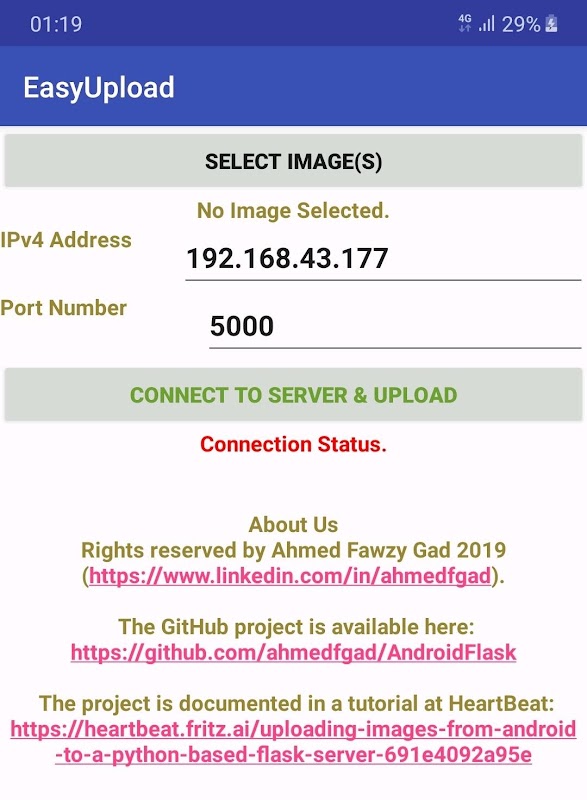 The project is very simple. Just select the images from the Android device, establish a connection to the server using its IPv4 address and port number, and then upload the images in a fast way.