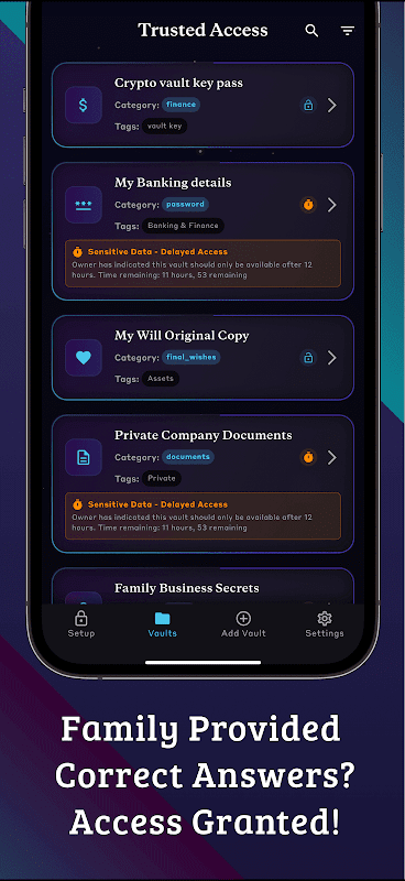 ห้องนิรภัยพื้นฐานจะปลดล็อกทันทีหลังจากที่ผู้ติดต่อที่เชื่อถือได้ตอบคำถามความปลอดภัยอย่างถูกต้อง เหมาะอย่างยิ่งสำหรับคำแนะนำในการบอกลา คำแนะนำที่สำคัญ หรือข้อความแสดงความเสียใจหลังจากการหายตัวไปหรือสูญหาย