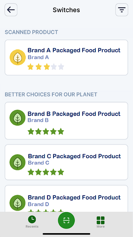 คุณสามารถสร้างทางเลือกที่ดีกว่าให้กับโลกของเราได้ด้วย ecoSwitch เพียงสแกนบาร์โค้ดเพื่อรับข้อมูล Planetary Health Rating ข้อมูลความยั่งยืนและสุขภาพของอาหาร และทางเลือกที่ดีกว่า