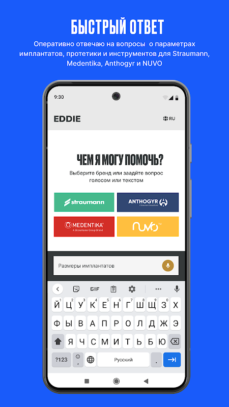EDDIE เป็นผู้ช่วยอัจฉริยะสำหรับทันตแพทย์ ศัลยแพทย์ ผู้เชี่ยวชาญด้านกระดูกและข้อ และผู้เชี่ยวชาญด้านทันตกรรมรากฟันเทียม ซึ่งช่วยค้นหาข้อมูลเกี่ยวกับผลิตภัณฑ์ของแบรนด์ Straumann, Anthogyr, Nuvo และ Medentika ได้อย่างรวดเร็ว