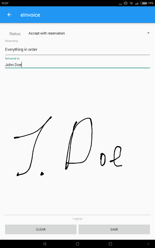 ผู้รับสามารถตรวจสอบใบแจ้งหนี้ให้ยอมรับหรือปฏิเสธมันและให้ลายเซ็นสำหรับผลบังคับใช้ หากการเชื่อมต่ออินเทอร์เน็ตที่ใช้งาน, หลักฐานการจัดส่งจะซิงค์กับโครงสร้างพื้นฐานคลาวด์ของเรามิฉะนั้นจะถูกซิงค์ครั้งหนึ่งเคยมีการเชื่อมต่อ
