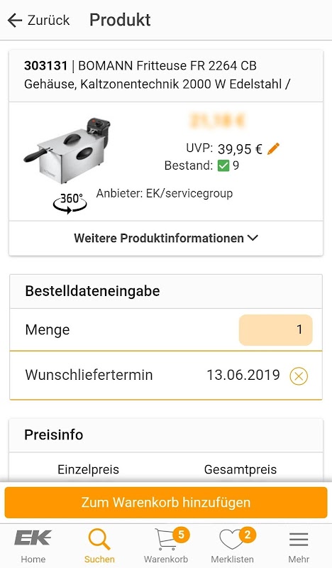 หัวใจของแอป EK คือการค้นหาข้อความเต็มรูปแบบอัจฉริยะ ด้วยคำแนะนำในการค้นหาเรียลไทม์การเลือกกลุ่มผลิตภัณฑ์และตัวกรองจะมีให้สำหรับคู่ค้าเป็นเครื่องมือช็อปปิ้งบนมือถือ นอกเหนือจากรายละเอียดเกี่ยวกับบทความด้วยภาพและคุณลักษณะของผลิตภัณฑ์แล้วคู่ค้ายังสามารถเข้าถึงโปรโมชั่นส่วนลดและคำสั่งซื้อปัจจุบันได้ นอกจากนี้ EK App ให้ความโปร่งใสด้านราคาสูงสุด ตัวแทนจำหน่ายมักจะเห็นราคาที่ดีที่สุดของตัวเองรวมถึงส่วนลดและเงื่อนไขพิเศษตลอดจนการประเมินผลกระทบสิ่งแวดล้อมหรือราคาขายที่คำนวณเป็นรายบุคคล