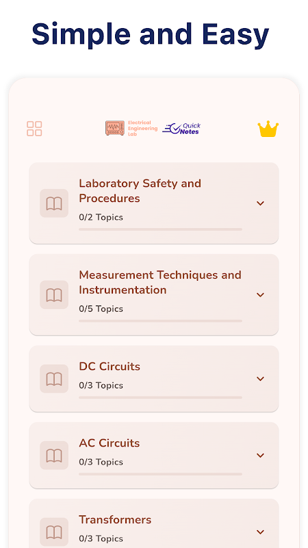 เพิ่มพูนทักษะของคุณในการทำงานในห้องปฏิบัติการวิศวกรรมไฟฟ้าด้วยแอปการเรียนรู้ที่ครอบคลุมนี้ ออกแบบมาสำหรับนักเรียน ช่างเทคนิค และผู้เชี่ยวชาญด้านวิศวกรรม แอปนี้นำเสนอคำอธิบายโดยละเอียด ขั้นตอนทีละขั้นตอน และกิจกรรมฝึกปฏิบัติแบบโต้ตอบเพื่อช่วยให้คุณเก่งในการทดลองในห้องปฏิบัติการและแนวคิดทางเทคนิค