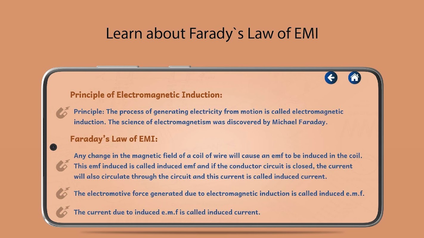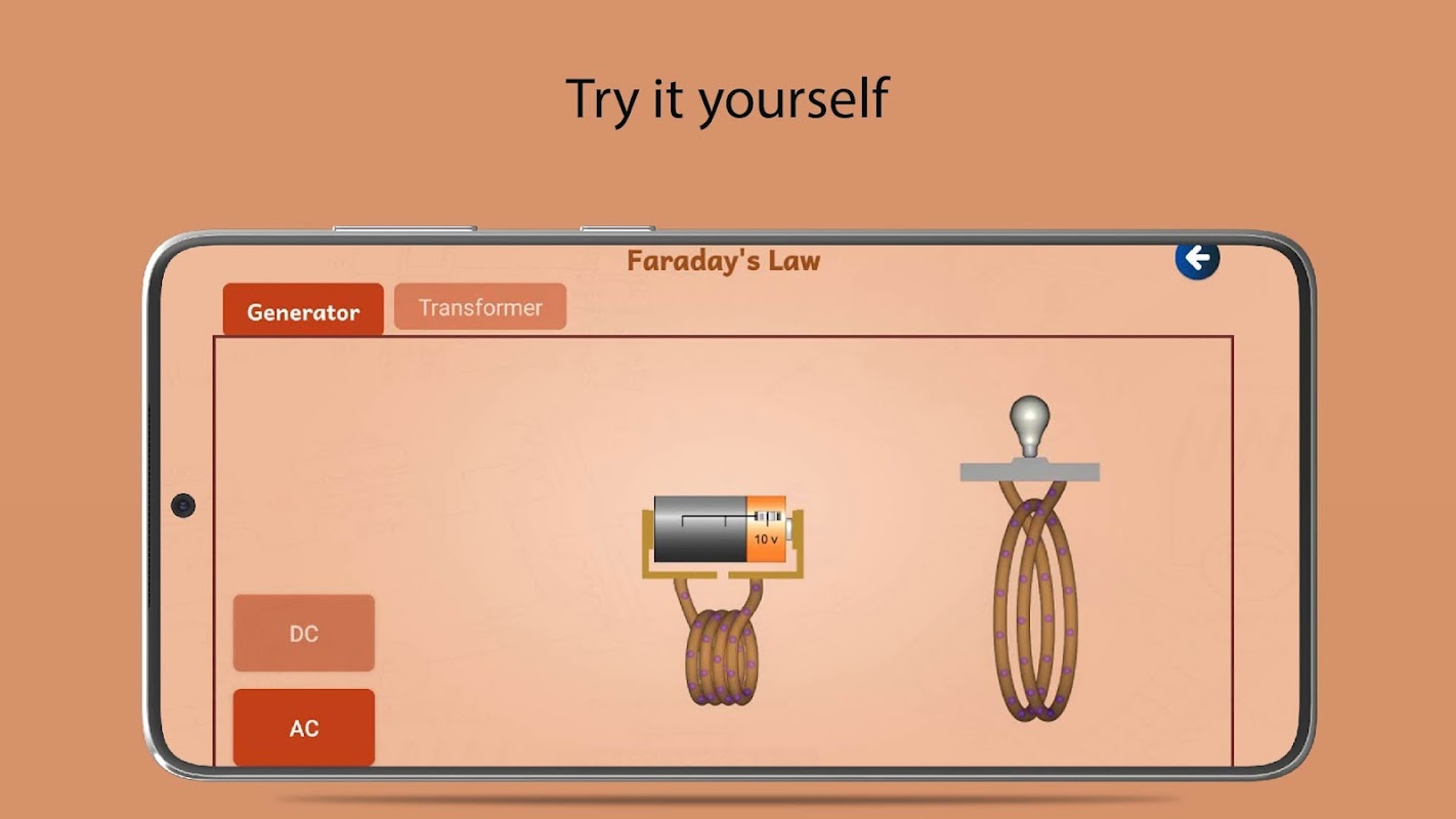 แอปการเหนี่ยวนำแม่เหล็กไฟฟ้าอธิบายหลักการของการเหนี่ยวนำแม่เหล็กไฟฟ้าและการทำงานของเครื่องกำเนิดไฟฟ้ากระแสสลับและหม้อแปลงไฟฟ้าด้วยความช่วยเหลือของภาพประกอบและภาพเคลื่อนไหว
