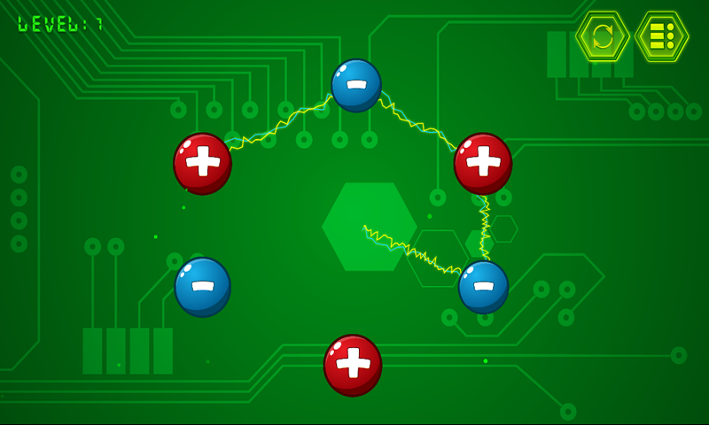 Simple intelligence game. You have to join positive and negative electrons by creating an enclosed electrical circuit by avoiding passing the power line over other lines present.