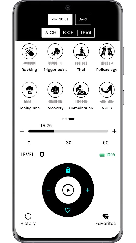แอพ eMP10 ใช้งานได้กับอุปกรณ์ไร้สาย eMP10 เท่านั้น แอพนี้มีโหมดที่ใช้วิธีการ TENS, EMS และ NEMS เพื่อกระตุ้นกล้ามเนื้อ ส่งเสริมการไหลเวียนของเลือด และบรรเทาอาการปวด