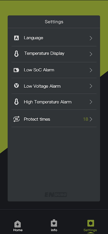 ระบบจัดการแบตเตอรี่อัจฉริยะ Enduro Battery เชื่อมต่อกับแอคทีฟอีควอไลเซอร์ผ่าน Bluetooth เพื่อตรวจสอบสถานะแบตเตอรี่ รวบรวม จัดเก็บ และประมวลผลข้อมูลระหว่างการใช้งานแบตเตอรี่แบบเรียลไทม์ และแลกเปลี่ยนข้อมูลกับอุปกรณ์ภายนอกเพื่อแก้ปัญหาด้านความปลอดภัย ความสะดวกในการใช้งาน และความปลอดภัย ของระบบแบตเตอรี่ลิเธียม ปัญหาสำคัญของอายุการใช้งานคือการยืดอายุการใช้งานของแบตเตอรี่และเพิ่มความเสถียรของแบตเตอรี่หลังการจัดกลุ่ม 1. แสดงแรงดันไฟฟ้า กระแสไฟ พลังงาน ความต้านทานภายใน และค่าพารามิเตอร์อื่นๆ แบบเรียลไทม์ ในรูปแบบแดชบอร์ดและจอแสดงผลดิจิตอล 2. แสดงแรงดันไฟแบบเรียลไทม์และสถานะการเตือนของเซลล์เดียวทั้งหมด หากพารามิเตอร์ที่รายงานทริกเกอร์ค่าการเตือนหรือค่าการป้องกัน ระบบจะแจ้งเตือน ; 3. การเปรียบเทียบ แต่ละข้อมูลของเซลล์ ความแตกต่างของแรงดันไฟฟ้า เซลล์แรงดันไฟฟ้าสูงสุด เซลล์แรงดันต่ำสุด และการแสดงความสมดุลของเซลล์ 4. เตือนอุณหภูมิเซลล์ อุณหภูมิเกิน ไฟฟ้าลัดวงจร แรงดันเกิน , สัญญาณเตือนแรงดันไฟต่ำตามเวลาจริง 5. บันทึกการเตือนที่เกิดขึ้นในแต่ละช่วงเวลา