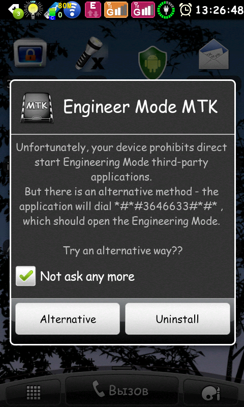 !!! แอปพลิเคชันเฉพาะสำหรับอุปกรณ์ที่ใช้ MTK (MediaTek) หากคุณมีแพลตฟอร์มอื่นคุณจะได้รับข้อความว่าอุปกรณ์ไม่รองรับข้อเสนอในการถอนการติดตั้งแอปพลิเคชันนี้