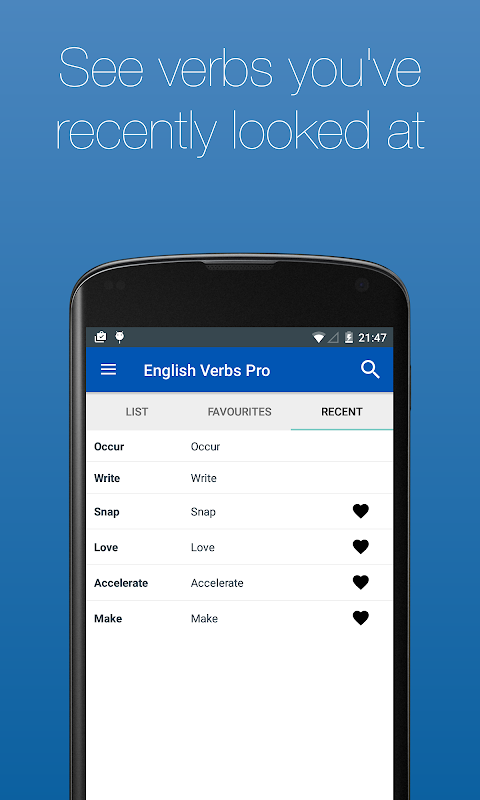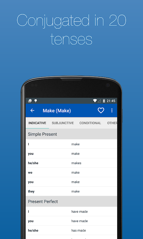 ตอนนี้มีเสียง!! ไม่แน่ใจว่าจะออกเสียงคำกริยาอย่างไร? ตอนนี้คุณสามารถได้ยินวิธีการออกเสียงคำกริยาทุกคำแล้ว เพียงแตะที่ปุ่มถัดจากการผันคำกริยา คำกริยาพร้อมเสียงจะมีสัญลักษณ์ผู้พูดอยู่ข้างๆ หมายเหตุ: ฟังก์ชันนี้ต้องใช้การเชื่อมต่ออินเทอร์เน็ต