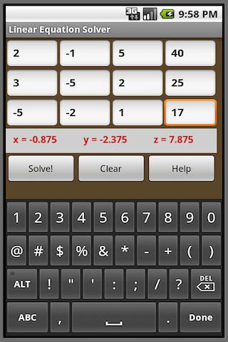 This application will solve a system of linear equations with either three variables or two variables. For example, let's say you have the system of equations: