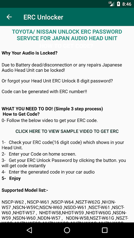 This applies to; Toyota 4Runner, Agya, Allion, Alphard, Aurion, Auris, Avalon, Avanza, Avensis, Aygo, bB, Belta, Camry, Coaster, Corolla, Axio, Fielder, Rumion, Crown, Crown Majesta, Dyna, Estima, Previa, Etios, FJ Cruiser, Fortuner, Highlander, Hilux, Hilux Surf, HiClass, Hiace, Innova, iQ, Isis, ist, Kluger, Land Cruiser, Land Cruiser Prado, LiteAce, Mark X, Nadia, Noah, Passo, Daihatsu Boon, Porte, Premio, Prius, Probox, Qualis, Ractis, Raum, RAV4, Rush, Sai, Sequoia, Sienna, Sienta, Sofia, Spade, Sparky, Succeed, TownAce, ToyoAce, Vanguard, Vellfire, Verso, Vios, Vitz/Platz/Yaris, Voxy, WISH, Yaris, Zelas and many others. Toyota Radio Models Supported. Year 2001 Radio Models; NMCN-D51M/W51M NMCT-D51/W51 Year 2002 Radio Models; NCKT-D52/W52 NCMT-D52/W52 ND3A-D52A/W52A ND3N-D52/W52 ND3T-D52M/W52M ND3T-D52V/W52V NDDP-D52R/W52R NDKT-D52/W52 NHMP-D52/W52 ND3N-W52T Year 2003 Radio Models; NCMT-D53/W53 ND3A-W53A ND3N-D53/W53 NDCT-D53/W53 NDCT-W53E NDDP-W53R NHDP-D53/W53 NHDT-W53 NHDT-W53M Year 2004 Radio Models; ND3A-W54A ND3T-D54/W54 NDCN-D54/W54 NDCT-W54E NHCT-D54/W54 NHDN-W54G NHDP-D54/W54 NHDT-W54V Year 2005 Radio Models; ND3T-W55 NDCN-D55/W55 NDDA-W55 NH3T-W55 NHDN-W55G NHDT-W55 NHXT-W55V Year 2006 Radio Models; ND3T-W56 NDDA-W56 NDDN-W56 NH3T-W56 NHDN-W56 NHDN-W56G NHDP-W56S NHXT-W56D Year 2007 Radio Models; ND3T-W57 NDDN-W57 NH3N-W57 NHDA-W57G NHDP-W57S NHDT-W57 NHDT-W57D NHZN-W57 Year 2008 Radio Models; NDDN-W58 NH3N-W58 NH3N-W58G NHDT-W58 NHDT-W58G NHZA-W58G NHZP-W58S NHZT-W58 NHZT-W58G Year 2009 Radio Models; NHDT-W59 NHDT-W59G NHZA-W59G NHZN-W59G NSCN-W59C NSDN-W59 NSDT-W59 Year 2010 Radio Models; NHDT-W60G NHZA-W60G NHZN-W60G NSCN-W60 NSDN-W60 NSZD-W60 NSZT-W60 Year 2011 Radio Models; NHZA-W61G NHZN-W61G NHZN-X61G NSCP-W61 NSCT-W61 NSDD-W61 NSZT-W61G Year 2012 Radio Models; NHBA-W62G NHBA-X62G NHZD-W62G NHZN-X62G NSCP-W62 NSCT-D61D NSLN-W62 NSZT-W62G NSZT-Y62G Year 2014 Radio Models; NSCP-W64 NSZA-X64T NSZN-W64T NSZT-W64 NSZT-Y64T NSZT-YA4T nhzn w59g nhdt w58 nscp w 62 Get Free Toyota Navigation Player ERC Unlock Code Online