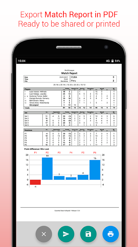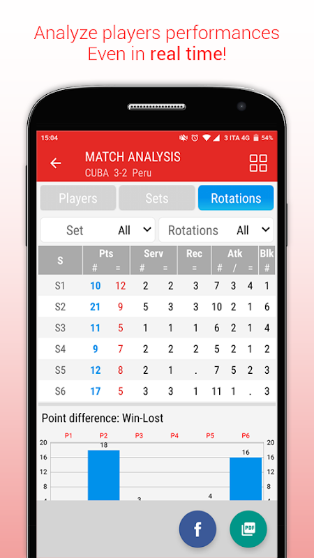 - Visualizza le statistiche relative a set, rotazioni e giocatori e filtra i dati per set e rotazione.