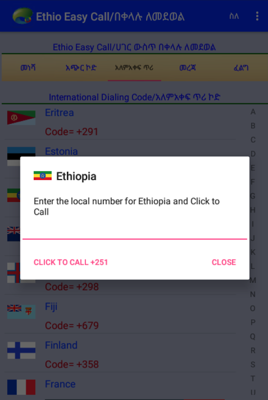 This App is designed to easily access the Ethiotelecom services through the USSD code. Easy Call is mainly designed to call easily the USSD short codes by only selecting the institutions and enter values easily without necessarily remembering the code and the sequences. It is menu driven and protect the users from any mistakes. It will in addition help you to call to any country without bothering the international code of each. Some additional functions like Ethiotelecom services, and search facility are also included. No pre agreement was made with Ethiotelecom in this regard.