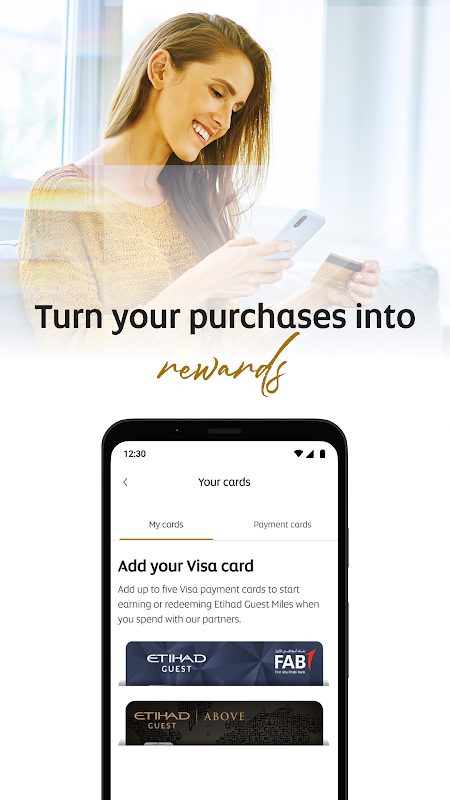 ใช้ประโยชน์สูงสุดจากแอพของคุณและเชื่อมโยงบัตรชำระเงิน UAE Visa ของคุณเพื่อเริ่มรับไมล์สะสม เมื่อใช้โปรแกรมเพียงปลายนิ้วคุณสามารถติดตามบัญชีผู้โดยสารของเอทิฮัดได้ทุกที่