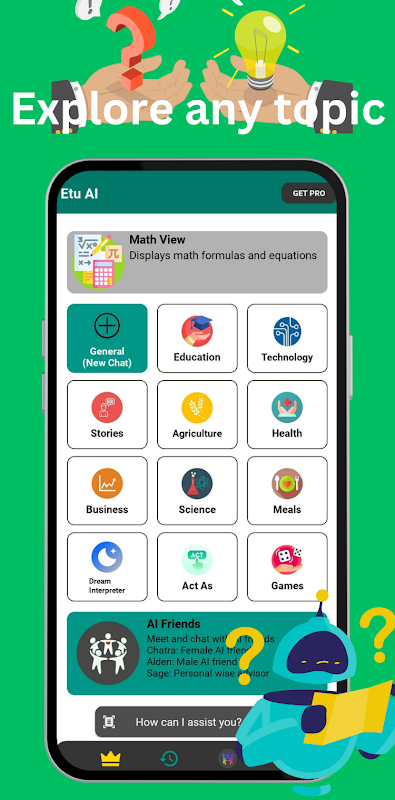 มุมมองคณิตศาสตร์: ไม่ว่าคุณจะเป็นนักเรียน ครู หรือผู้ที่เกี่ยวข้องกับแนวคิดทางคณิตศาสตร์บ่อยครั้ง Etu-AI ก็พร้อมช่วยเหลือคุณ ด้วยมุมมองทางคณิตศาสตร์ คุณสามารถป้อนนิพจน์ทางคณิตศาสตร์ที่ซับซ้อนได้ และ Etu-AI จะให้คำตอบและคำอธิบายแก่คุณ ช่วยให้คุณเชี่ยวชาญความท้าทายที่เกี่ยวข้องกับคณิตศาสตร์ได้อย่างง่ายดาย