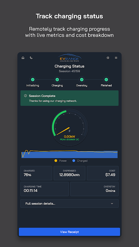 • เริ่มเซสชั่นการชาร์จใหม่ ดูสถานะการชาร์จปัจจุบันของคุณ และสิ้นสุดเซสชั่นการชาร์จของคุณจากระยะไกล