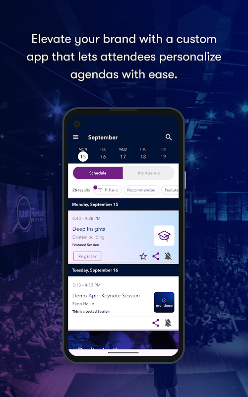 แอป Eventbase Showcase อย่างเป็นทางการ Eventbase Showcase เป็นวิธีที่ยอดเยี่ยมในการทำความเข้าใจแพลตฟอร์มแอปมือถือ Eventbase แบบเจาะลึกและลงมือปฏิบัติจริง รวมถึงทำความเข้าใจวิธีที่เราสนับสนุนอีเวนต์สด และมั่นใจว่าผู้เข้าร่วมงานของคุณจะได้รับประสบการณ์ที่ยอดเยี่ยม ณ สถานที่จัดงาน สำรวจฟีเจอร์ต่างๆ ของเรา เช่น การจัดตารางเวลา การนำทาง การสร้างเครือข่าย การมีส่วนร่วม และการสนับสนุน มาดูวิธีที่เราสร้างแอปมือถือที่ออกแบบเฉพาะตัว เป็นแบบ White Label และผสานรวมอย่างลึกซึ้งสำหรับงานอีเวนต์ใหญ่ๆ ระดับโลก เช่น SXSW, CES, Dreamforce และอื่นๆ